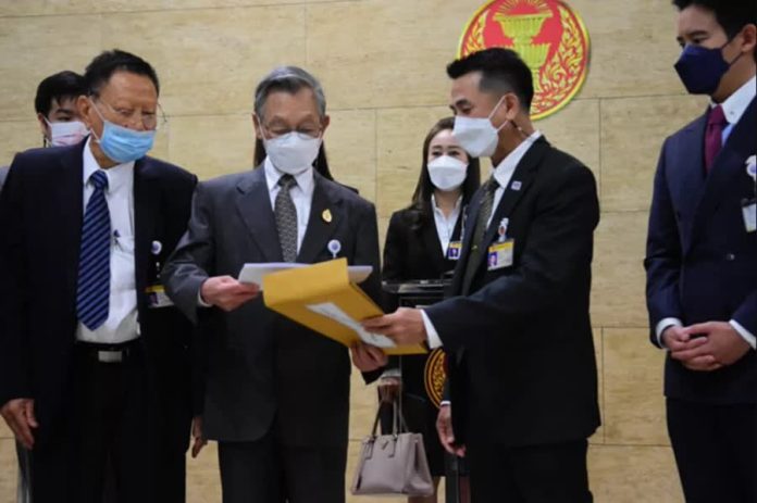 Opposition leader Chonlanan Srikaew submitted a letter to Parliament President Chuan Leekpai to be forwarded to the Constitutional Court. The letter is signed by 171 Opposition members and requests the court consider Gen. Prayut Chan-o-cha’s term in office reaching 8 years.