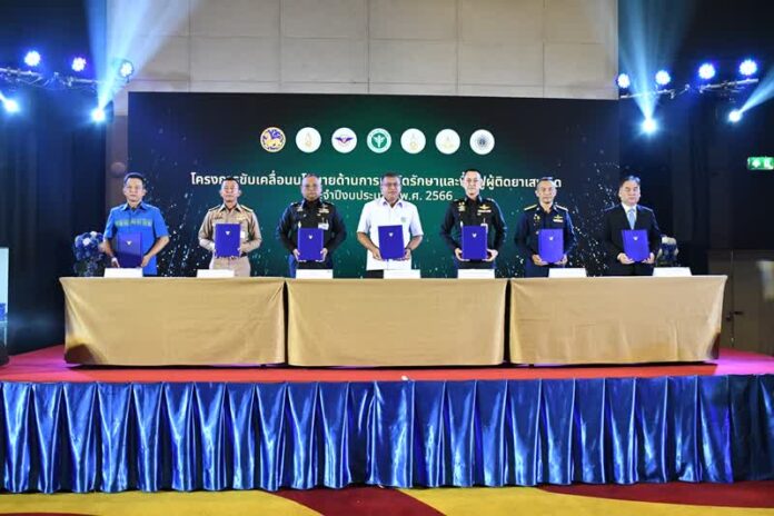 Dr. Yongyot Thammawut, Deputy Permanent Secretary for Public Health, presided over the signing ceremony between the Ministry of Public Health, the Royal Thai Armed Forces Headquarters, the Royal Thai Army, the Royal Thai Navy, the Royal Thai Air Force, the Department of Provincial Administration, and the Office of The Narcotics Control Board.