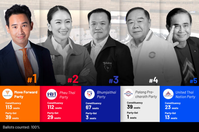On May 15, the Election Commission (EC) announced the highly anticipated results of the recent election, revealing the Move Forward Party (MFP) as the triumphant winner after an intense period of ballot counting. The EC Chairman, Ittiporn Boonpracong, disclosed the outcome, which showcased Pita Limjaroenrat’s Move Forward Party securing a total of 112 constituency seats and an additional 39 party list seats.
