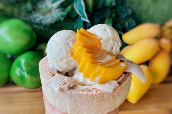 The shop’s most popular menu item, the Coconut Sundae, showcases the essence of their concept. Real coconut shells serve as the vessel, filled with three scoops of their signature coconut ice cream and topped with a choice of delectable options. Mango, a crowd favorite, takes the spotlight, closely followed by Mun Sticky Rice. The latter is a harmonious blend of homemade sticky rice, sweet and ripe mangoes, sprinkled with roasted sesame seeds, and generously drizzled with the shop’s special recipe of coconut milk.