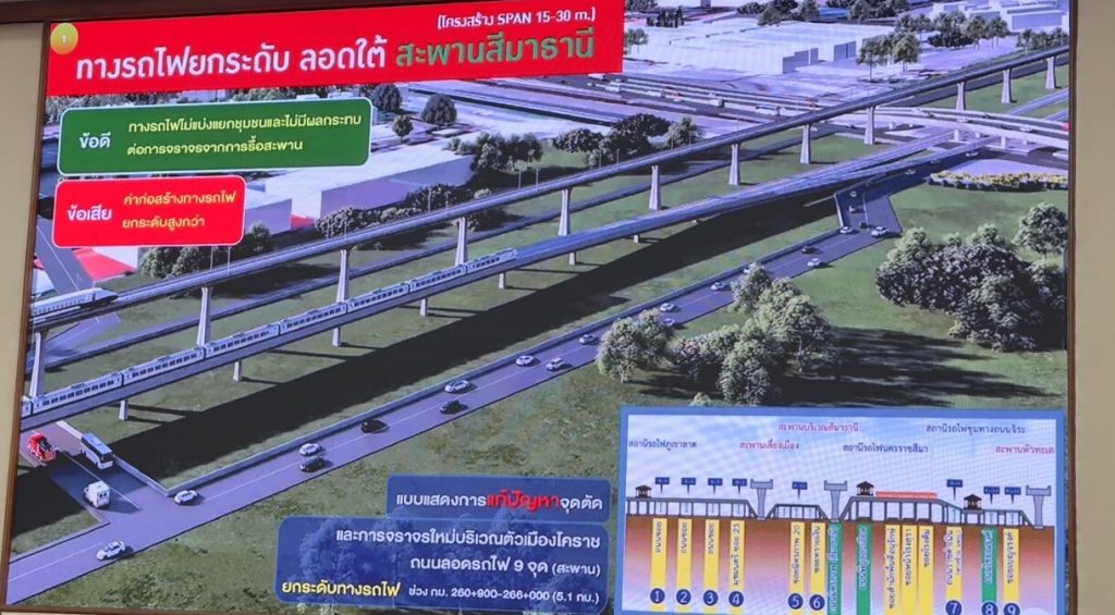 2. Elevated Railway Crossing Simathani Bridge: This alternative entails raising the railway to cross the Simathani Bridge, potentially impacting the Bangkok-Nakhon Ratchasima high-speed rail project. This might necessitate relocating Korat Station or elevating the railway through Korat Station and lowering it at Jira Station.