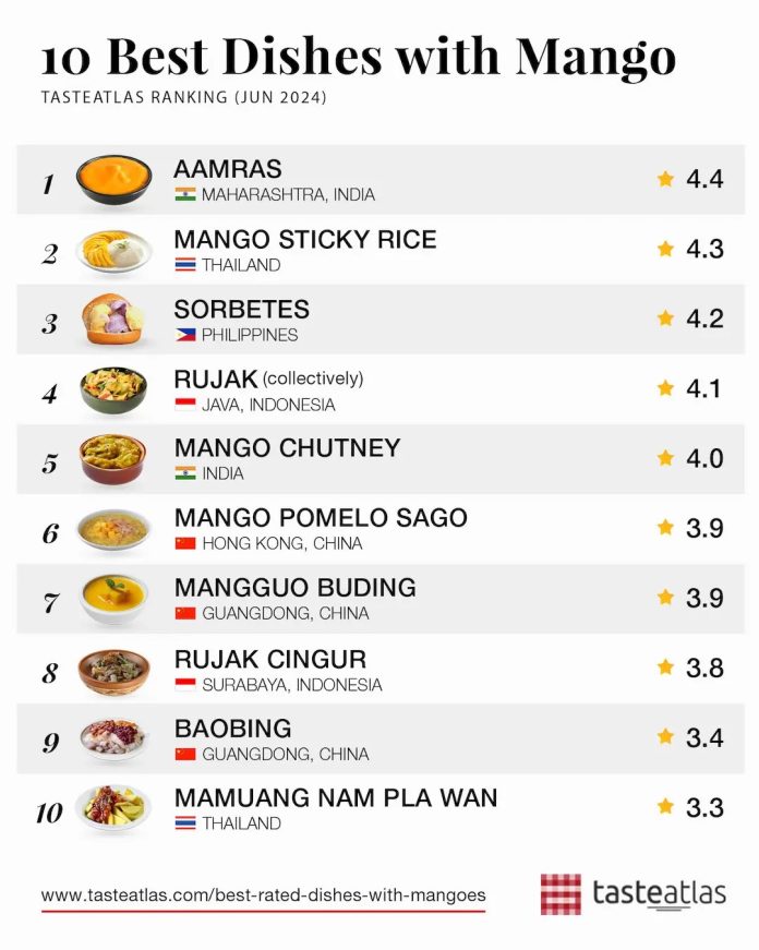 TasteAtlas, a renowned culinary website featuring rankings and reviews by food critics worldwide, included five Thai mango dishes in their top 26 list. Thai Mango Sticky Rice, a beloved dessert consisting of sweet mango slices with coconut sticky rice, was ranked 2nd. Another dish, Thai Green Mango with Sweet Fish Sauce, made from tart Thai mangoes paired with a sweet and salty fish sauce, ranked 10th.