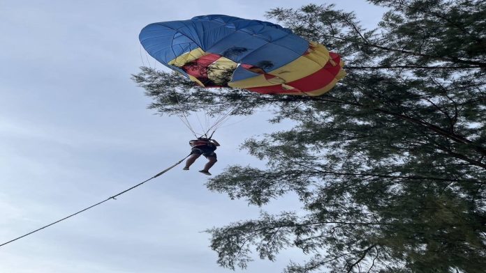 On Monday evening, a Saudi Arabian tourist found himself in a precarious situation after a parasailing excursion went awry. At around 6:00 p.m., 26-year-old Mr. Wahab was blown off course by strong winds and became stranded in a casuarina tree near Kamala Beach in Phuket Province.