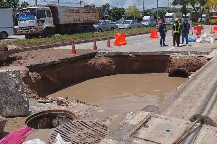 A significant sinkhole, measuring approximately 10 meters in width, 5 meters in length, and 3 meters in depth, emerged at the Kesa Komon intersection on Nakhon Chai Si Road in the Dusit District of Bangkok. The incident, attributed to road subsidence, prompted authorities to close the affected traffic routes urgently late Sunday night.