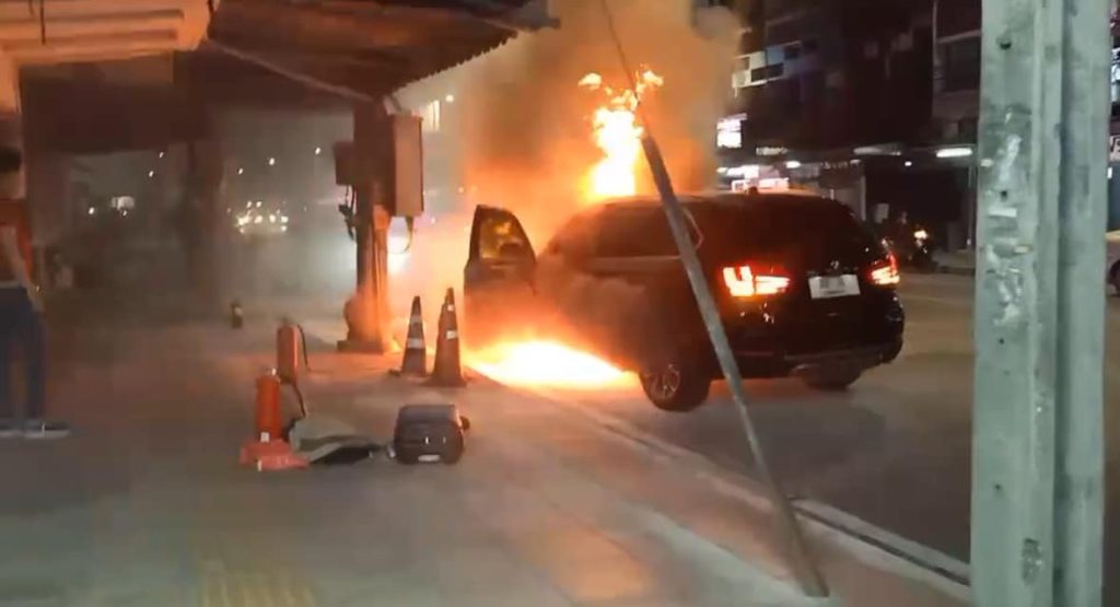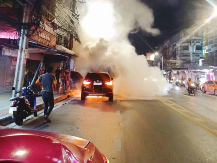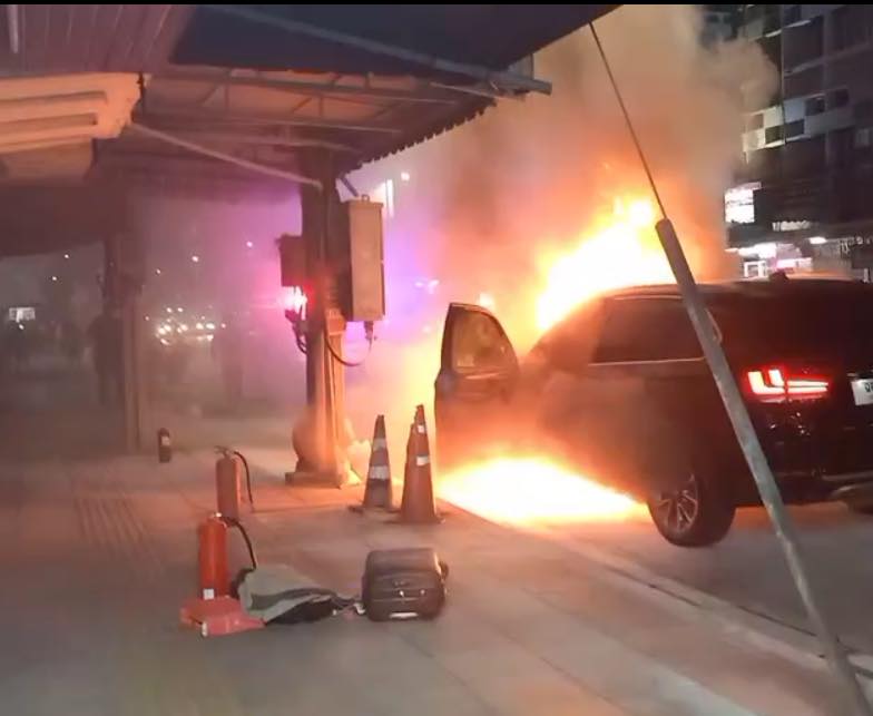A car caught fire on Sukhumvit 103, Bang Na district on the evening of October 7, 2024. At approximately 8:55 p.m., authorities received a report through the 199 emergency hotline about a vehicle fire on Soi Udom Suk 1. Fire and rescue units from Bang Na were dispatched to the scene.