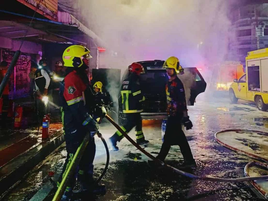 By 9:01 p.m., the Bang Na fire and rescue team had arrived at the location where a private vehicle was found engulfed in flames. Firefighters were actively working to extinguish the blaze. It was reported that no injuries have been confirmed, though authorities continue to assess the damage and investigate the cause of the fire.