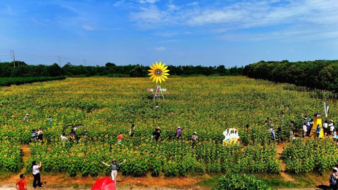 While enjoying the sunflowers, visitors can also check out the Mini Zoo zone, where children can engage in activities such as feeding rabbits, goats, pigs, and calves, creating a fun and interactive atmosphere for families.