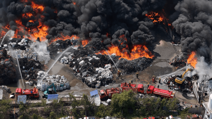 A massive fire has been raging for hours at a recyclable plastics warehouse in Samut Sakhon’s Ban Paew district, as firefighters struggle to contain the flames. The blaze, which broke out around 10 a.m. on January 29, 2025, quickly engulfed multiple storage facilities filled with highly flammable plastic waste from electricity cables.
